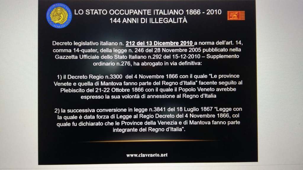 (P.B.) โCalderoli il 13 dicembre 2012, cancellando 357 decreti, non solo abrogรฒ per sbaglio il โplebiscito truffaโ del 1866 che sanciva l’annessione del Veneto al Regno d’Italia, ma anche il Regio decreto che lo confermava: praticamente dal 2012, solo volendolo e costituendolo, riconoscendolo come proprio, lo Stato Veneto puรฒ legalmente esistere anche senza lotta!
