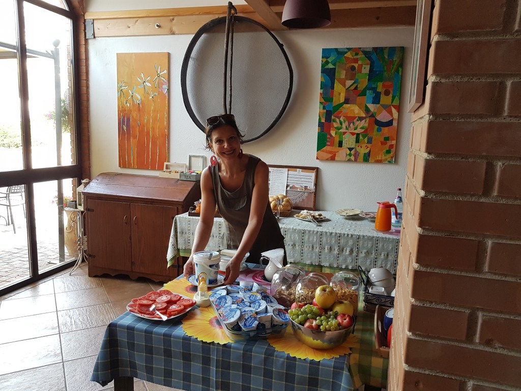 (Mara):โDunque, noi produciamo del rosรจ frizzante, chardonnay ed un rosso valdadige e li offriamo all’arrivo dell’ospite: attenzione, li offriamo come benvenuto della nostra produzione perchรฉ non facciamo ristorazione, come detto. Poi abbiamo piantato lungo la linea dell’arrivo dalla strada piante a frutteto, una per tipo: io faccio molte marmellate, mi diletto (santa pazienza!,ndR) e faccio torte che servo per la prima colazione, poi abbiamo la verdura e le uova dalle nostre galline per la colazione continentale che amano tanto i nostri ospiti. Attenzione: se il vino piace e ne vogliono ancora, noi consigliamo la Cantina Valdadige, abbiamo qua i depliant e spieghiamo come arrivare, perchรฉ non possiamo vendere i nostri.โ